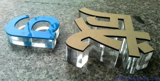 水晶字是用化學(xué)水將透明有機(jī)玻璃(亞克力)跟有色有機(jī)片粘合起來組合而成。成型時(shí)可以將透明有機(jī)玻璃和有色有機(jī)片分開來雕刻,也可先用化學(xué)水粘合后再一起雕刻。由燈光照射看起來非常好看,它可以用在室內(nèi)和室外,不怕日曬雨淋。是一種性價(jià)比較高的高檔字。